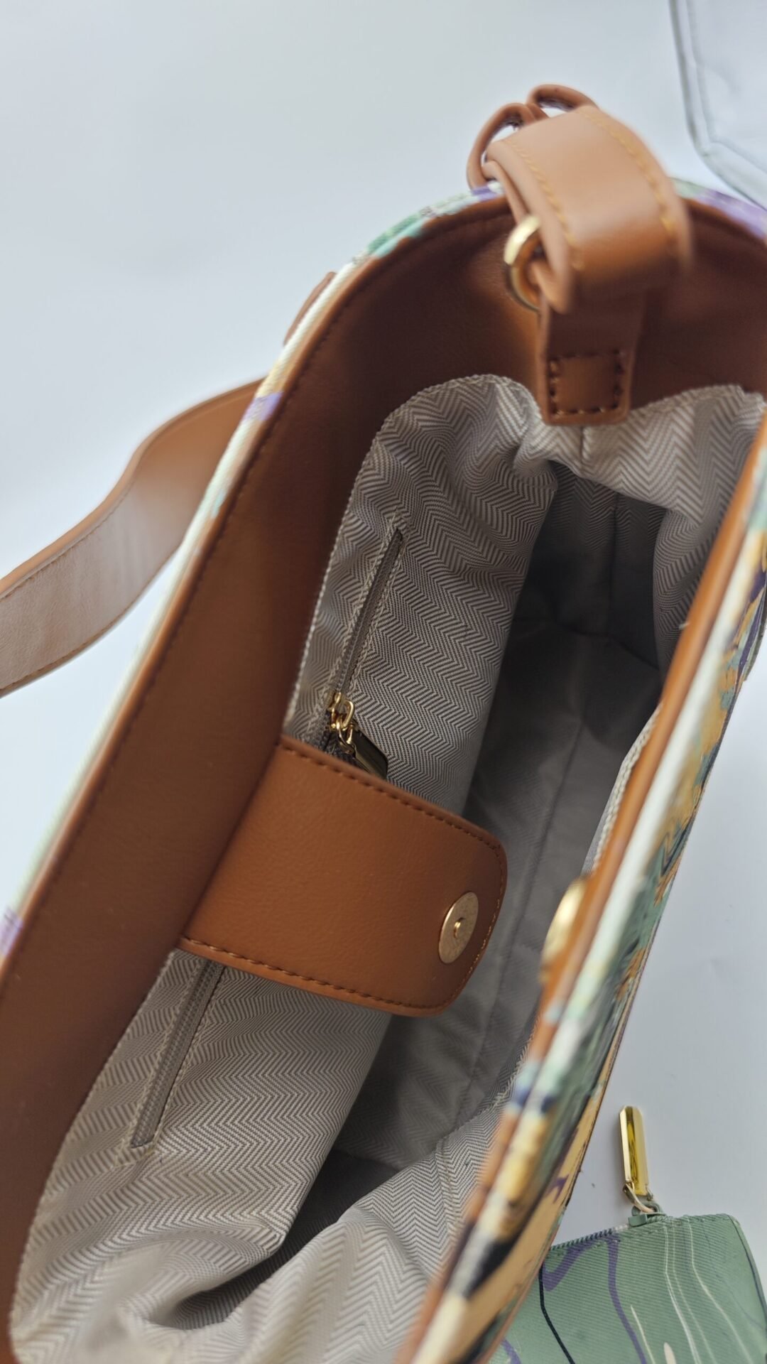 The large bag and the small pouch share the same signature pattern. The striking contrast between purple-brown and warm yellow brims with visual tension, while forest green lines define distinct layers. It’s as if the twilight of an entire flower field has been fused into the bags. Every texture is one-of-a-kind, ensuring your style stands out from the crowd.